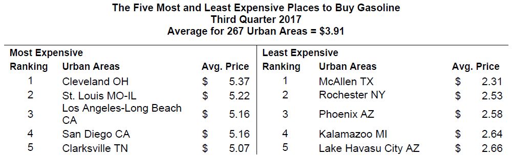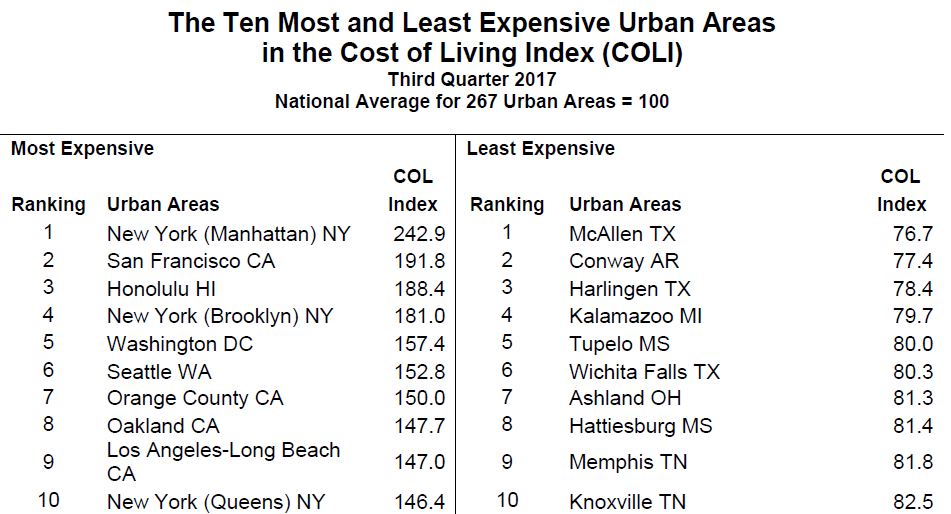 Among the 267 urban areas that participated in the third quarter 2017 Cost of Living Index, the after-tax cost for a professional/managerial standard of living ranged from more than twice the national average in New York (Manhattan) NY to more than 20 percent below the national average in McAllen, TX. The Cost of Living Index is published quarterly by C2ER – The Council for Community and Economic Research.