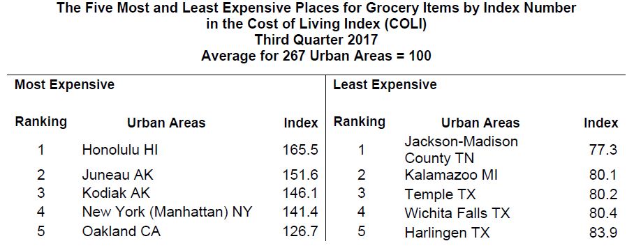 Each quarter, C2ER collects more than 90,000 prices from communities across the US for the Cost of Living Index. With food prices a big part of the national media attention, C2ER decided to once again feature those communities with the most and least expensive food costs as measured by the grocery item index number. C2ER collects data on twenty-six items from a variety of surrogate categories to represent the grocery item component of the index.