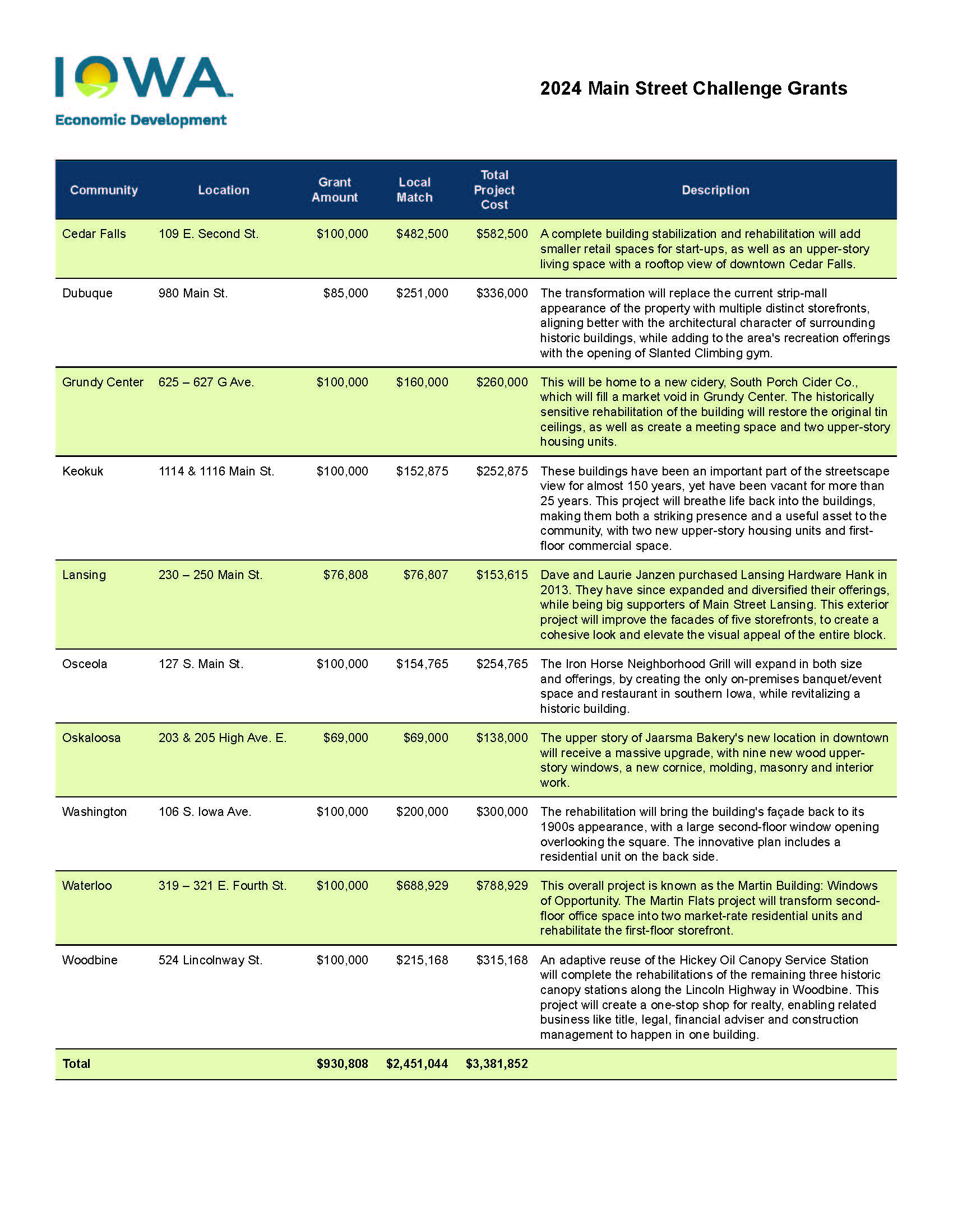 "Challenge Grants help us preserve rich historic character while breathing new life into our traditional downtowns and neighborhood commercial districts," said Debi Durham, director of IEDA and Iowa Finance Authority. "New businesses and residents are drawn to energized main streets, which radiates outward to grow local economies across the state."