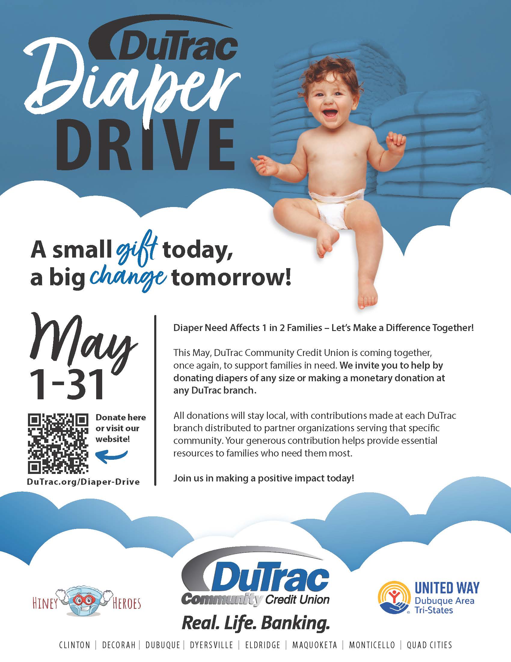 Community members are encouraged to donate diapers of any size or make a monetary contribution to Venmo @DuTrac-CommunityCreditUnion or at any DuTrac branch location during the month of May.