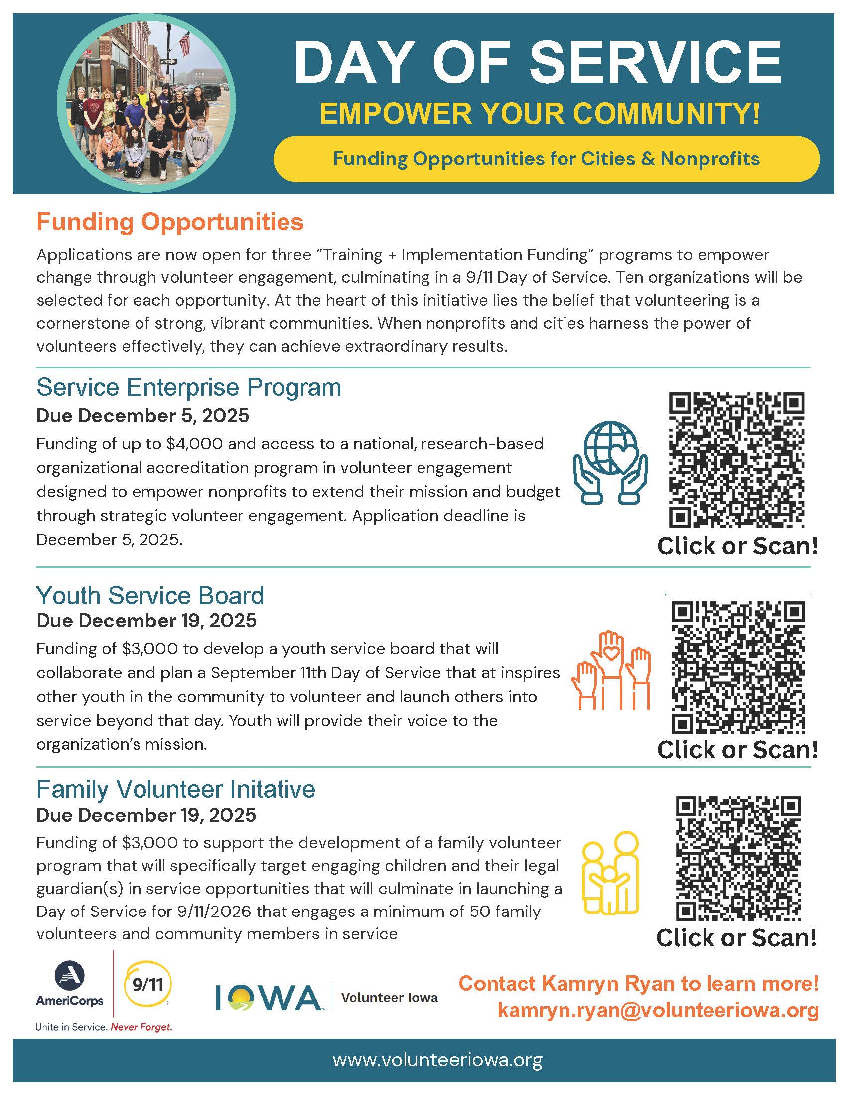 Volunteer Iowa is excited to share three new funding opportunities designed to help Iowa cities strengthen local volunteer engagement, youth leadership, and community connections. These initiatives offer funding, training, and resources that can support your city’s efforts to build stronger, more connected communities.