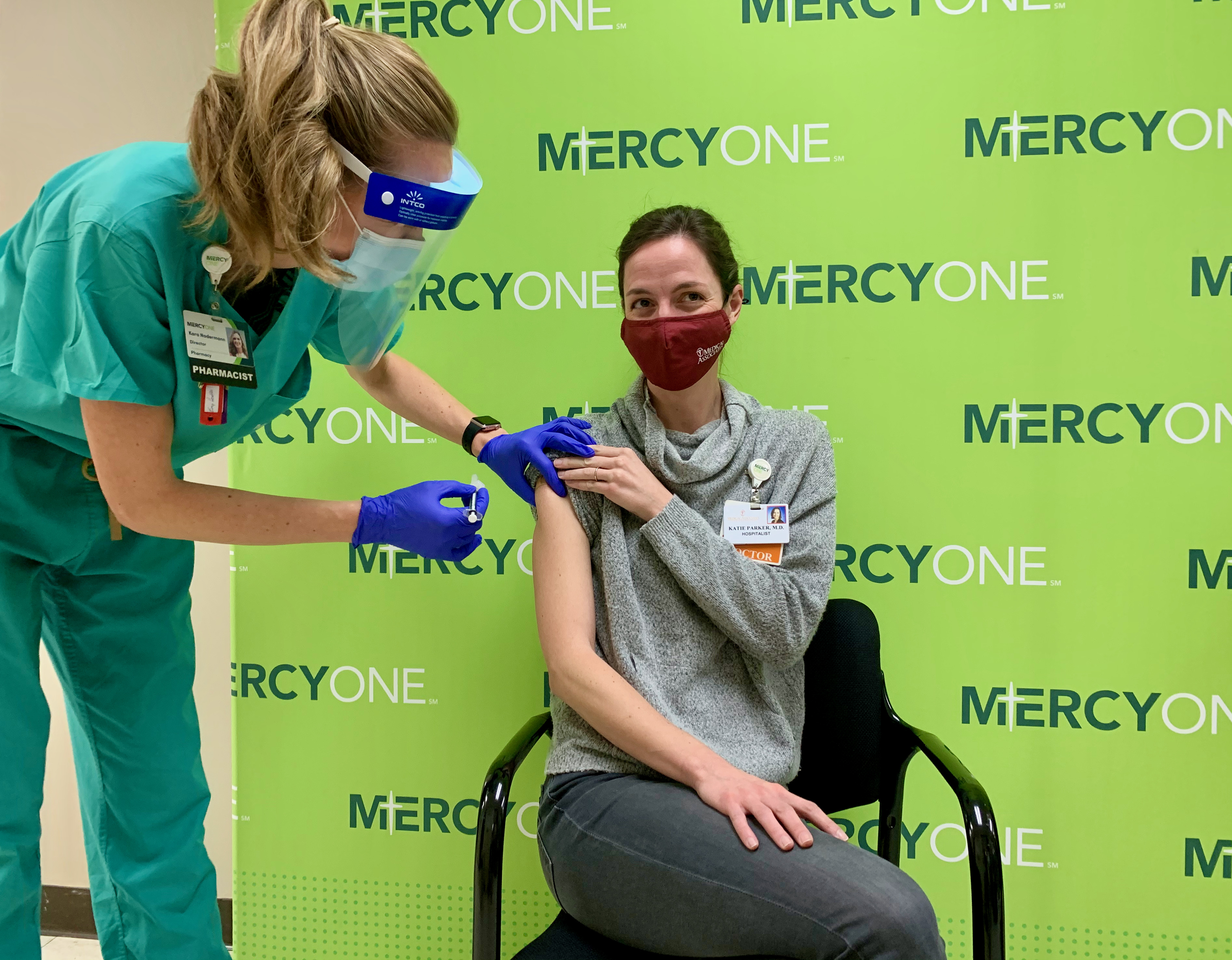 MercyOne Dubuque pharmacy director Kara Nadermann administers the COVID-19 vaccine to Dr. Katie Parker, chair of the hospitalist program at Medical Associates Clinic and medical director at MercyOne Dubuque Medical Center.