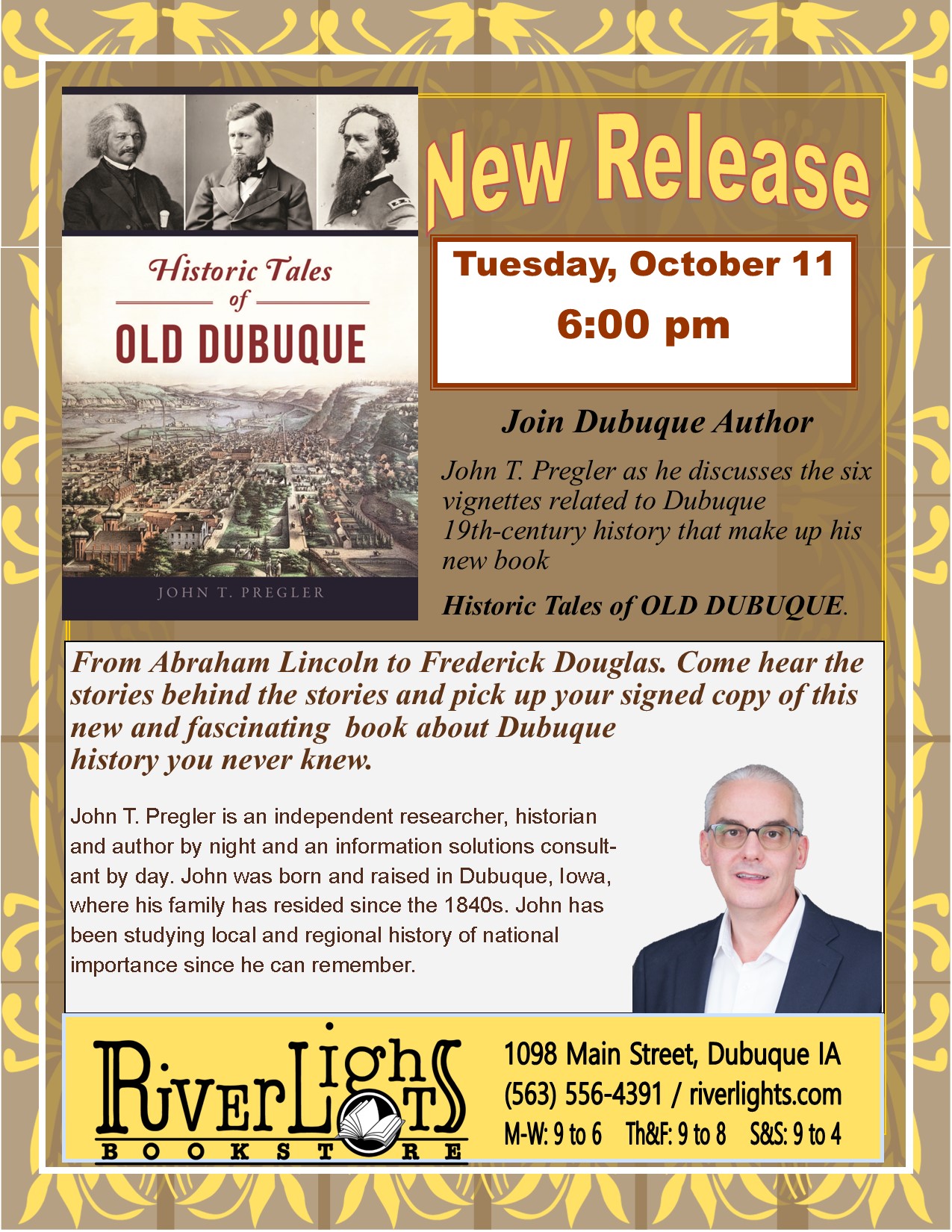 On Tuesday, October 11, John T. Pregler will be at River Lights Bookstore, 1098 Main St., Dubuque IA to introduce his work, Historic Tales of Old Dubuque, released by The History Press on October 10.