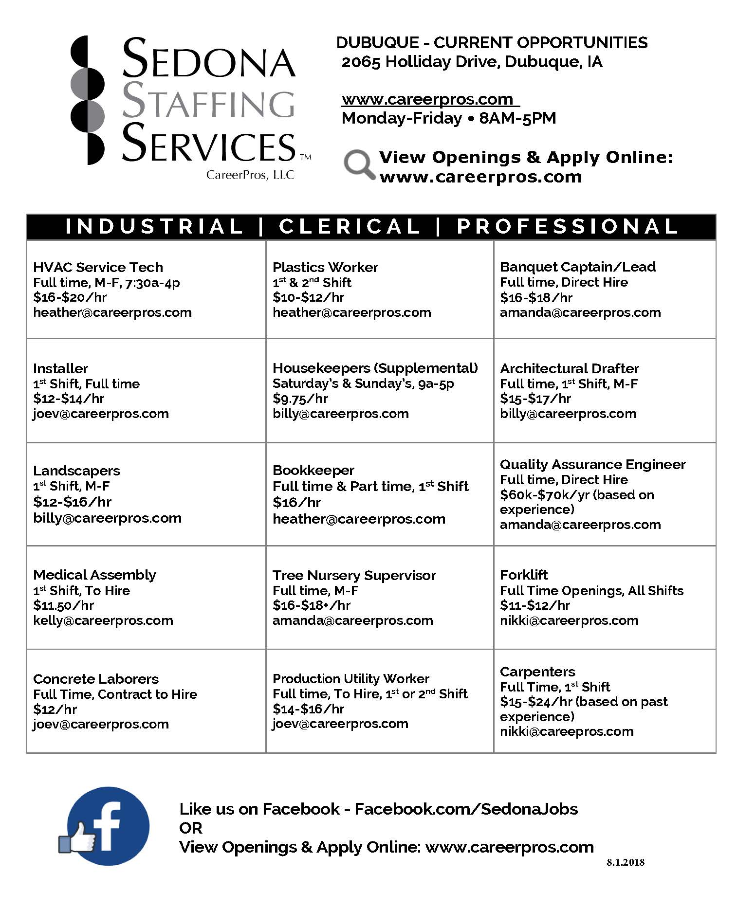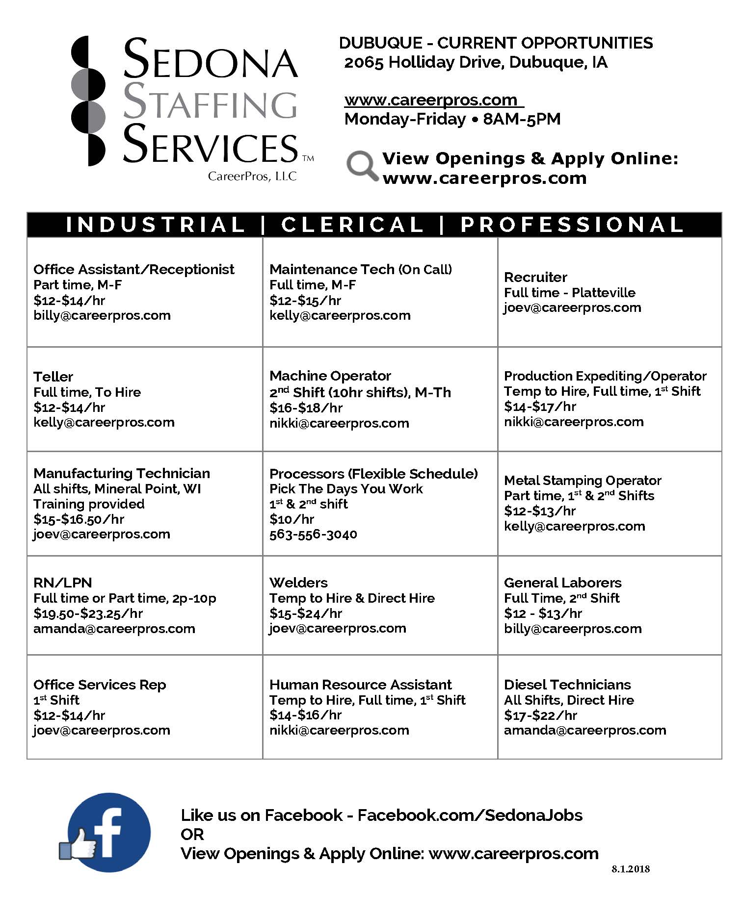 Below is Sedona Staffing Dubuque's most recent job listing sheet for the Dubuque area.