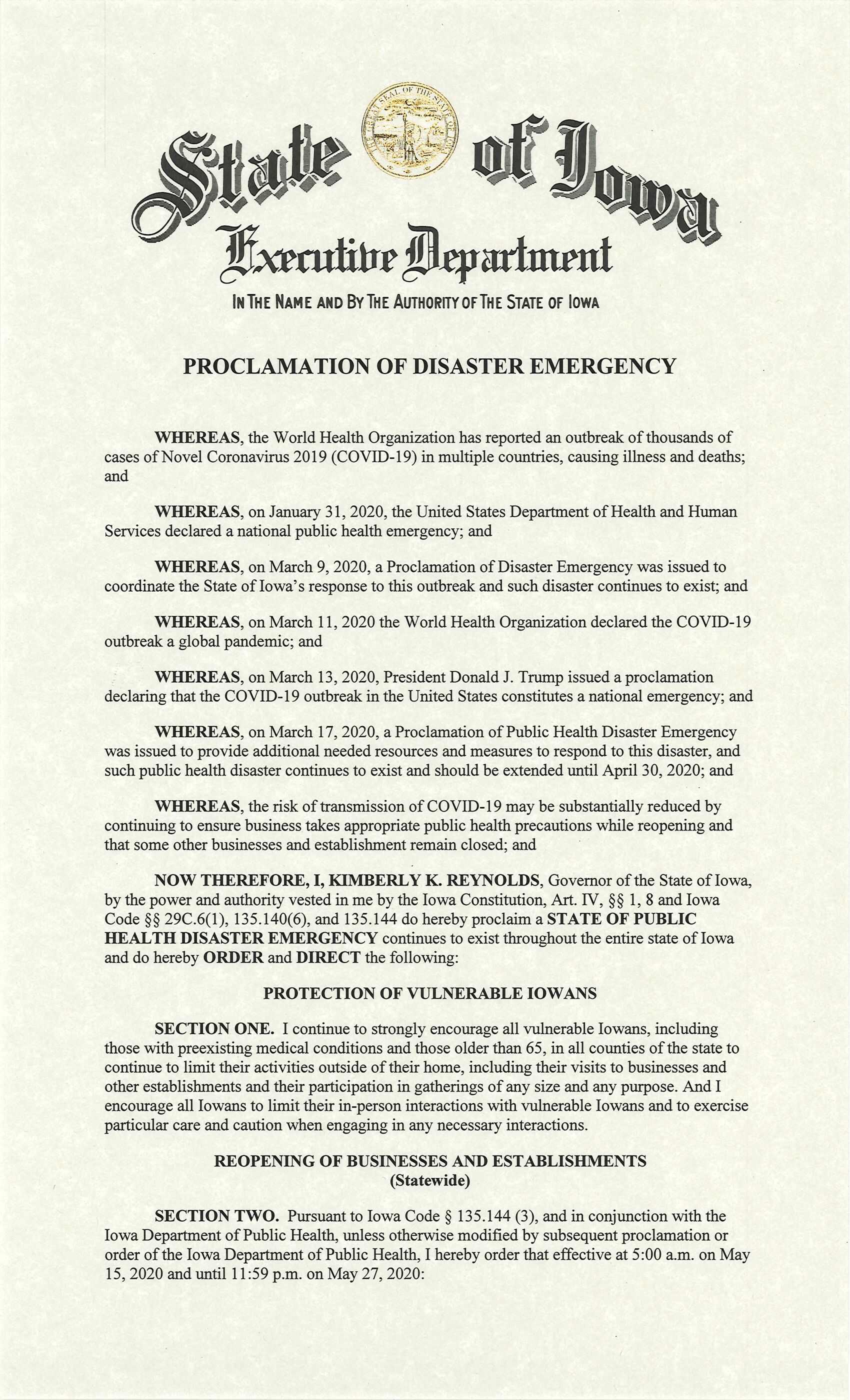 It also strongly encourages all vulnerable Iowans, including those with preexisting medical conditions and those older than 65, in all counties of the state to continue to limit their activities outside of their home, including their visits to businesses and other establishments and their participation in gatherings of any size and any purpose