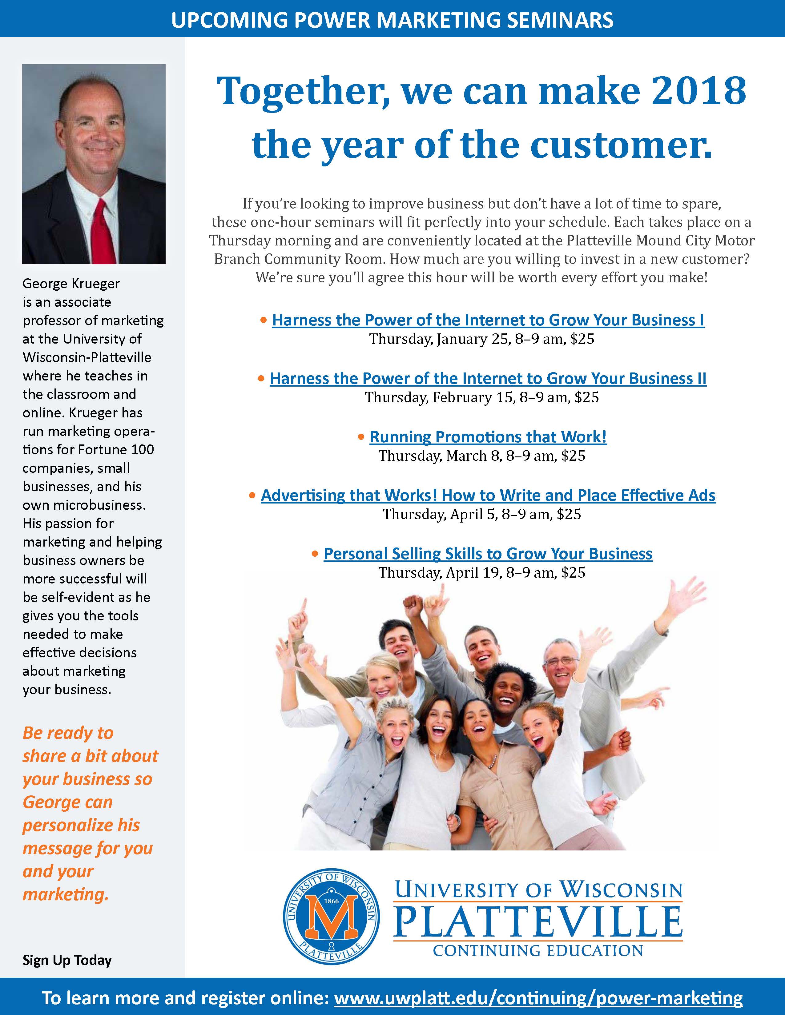 The Office of Continuing Education at UW-Platteville is pleased to offer a series of Power Marketing seminars that will help you make 2018 the year you will grow your business by attracting and retaining new customers. Please click on this link for more information: www.uwplatt.edu/continuing/workplace-solutions.